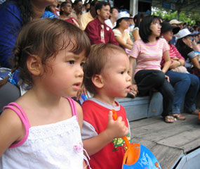 It has been a fun week for us. We moved to the Eastin hotel and met up with some friends that we had met in Railey, Thailand a few months ago. They came with another family from Germany. There are 3 children (ages 8, 13 and 13 ) so Kayla and Ryan really love being with them. Our rooms even have connecting doors. Our first day out together was at the floating market. We had to wake up at 7am to head out of Bangkok. The drive took an hour and a half. The kids didn't care much about shopping because they liked to go the playground more. Our second outing with one of 13 year old girls, Alena, was to Safari World. The kids got to see a seal, dolphin and Beluga whale show. The kids enjoyed them even though it was hot and humid. Then we all got into a bus and drove around a big open safari zoo. We got to see zebras, rhinos, deer, lions, tigers, giraffes and other animals up really close. Too bad the kids fell asleep half way through the ride. Tonight, we left the kids with our friends to have a date night. We went to the Outback Steakhouse because we haven't had a good steak in a while. We love you and will email you again. Anh, Stephen, Kayla, and Ryan July 13 |