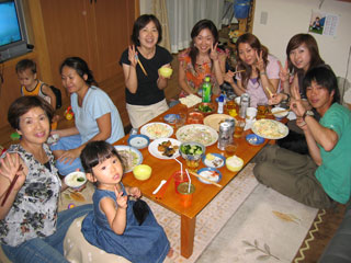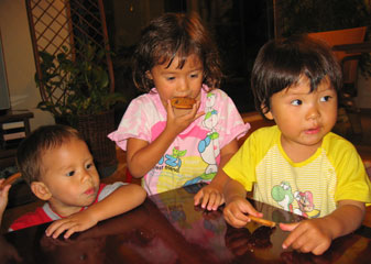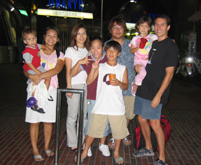 Yesterday we went to visit a friend, Soness, who lives near the beach. We met her 5 years ago in Railay, Thailand when Stephen and I were vacationing and rock climbing and kept in touch with her. She was originally from Florida. The kids really enjoyed themselves because she teaches English and entertains children for a living. Her house was filled with books and children's games. We also went to the beach at 7pm with her and her friends to a bar called Sputnik. There was loud rave music and people dancing on the sand. Lucky for us, there were also other children. Kayla was dancing all night and met a 4 year old girl. As we watched our kids dance and playe with their sand toys and their new friends, we thought how they had changed. Seven months ago, they didn't even like crowds and the sand. Here we were partying away until 11pm on a beautiful night with the full moon above us. Here is a thought for everyone - we can't figure out why everyone in Japan backs into their parking spaces. We were even told to do it in a parking garage. We miss you and can't wait to see everyone soon. Anh |