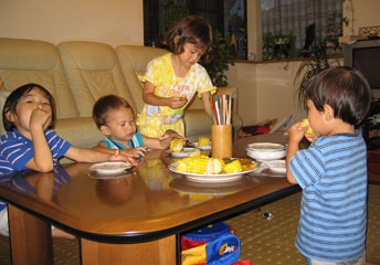 Another upside is the wonderful food. Like the Vietnamese, they have all types of noodles. Some noodles are served cold and some are served hot. Either way, we love it. We also love yakiniku, another similarity to the Vietnamese, where they cook the meat and vegetables on a grill in the middle of the table. The kids go crazy when it comes to yakiniku. And we can't forget the sushi. We can buy the fish (shashimi) pre-cut from the store and it's also nicely decorated. All we have to do is make the rice. Most of these meals are eaten at home so it's very relaxing for us. The kids just play with the other kids. We also love the arcades here. The kids went to bed early yesterday so Stephen and I went on a date. We spent 3 hours at the arcade playing token games (the ones where you put tokens in and win tokens back). There were many types of machines and all were very well designed. We spent $70 dollars in 3 hours ($1= 10 tokens). These token games were cheaper to play than the other arcade games which were $2 each. We also went to eat and got home at 2 AM. That was the first in a long time. We went over budget yesterday. The one big problem we are going to have is to get the kids into their car seats when we get home. We haven't used one since February. We thought that Japan has a strict law with children using car seats, but apparently it's not. They don't even use seat belts. We are not looking forward to the ride home from SF airport. We love you and can't wait to see you. Anh |